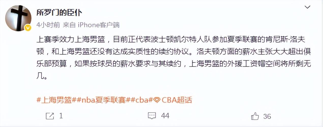 据知名篮球媒体人所罗门的臣仆透露,上海久事与外援洛夫顿续约谈崩,双方在薪水方面分歧较大,CBA规定的外援工资帽是425万美元,而洛夫顿希望得到的薪水是350万美元左右,如果上海久事满足洛夫顿的薪资要求,另外三名外援可操作空间就非常少了,除非久事管理层愿意按篮协要求超过工资帽部分缴交调节费,这也是卢伟指导为何现身夏季联赛考察外援的主要原因。