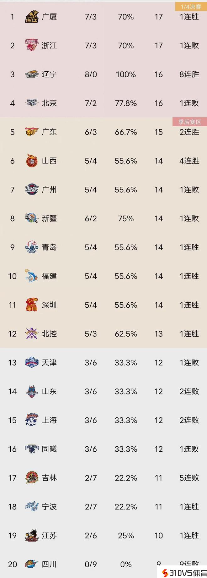 CBA最新积分榜,广厦96:90浙江,多赛两场升第一,辽宁全胜排第三