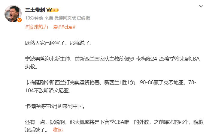 而媒体人@三土带刺随后发文表示,卡梅隆可能是新赛季CBA唯一的洋帅,原文如下。