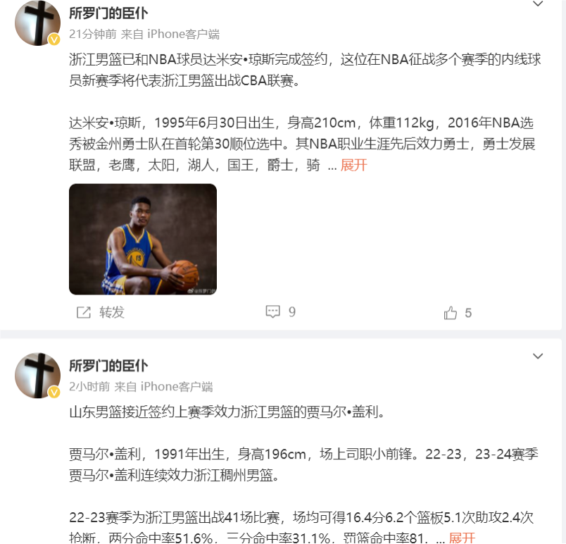 北京时间8月2日,媒体人“所罗门的臣仆”透露了CBA的两则外援签约消息,浙江男篮已经与NBA球员达米安-琼斯完成签约,山东男篮则接近签下上赛季效力于浙江男篮的外援盖利。所罗门的臣仆原文内容如下: