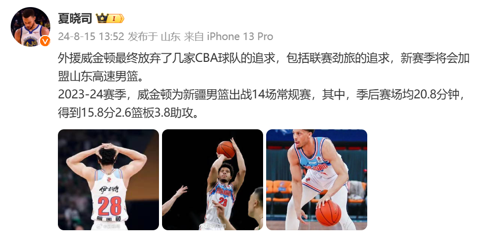 北京时间8月15日讯,根据媒体人@夏晓司报道:威金顿新赛季将会加盟山东高速男篮。原文如下: