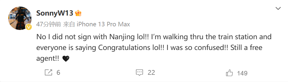“不,我没有与南京签约(大笑)!!!当我从火车站走过的时候,每个人都在对我说恭喜(大笑)!!!我太困惑了!!我仍然是自由球员!!🤎"