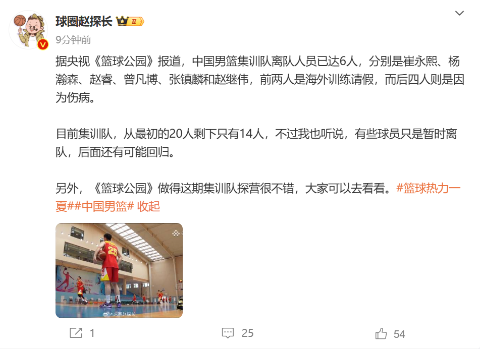 “据央视《篮球公园》报道,中国男篮集训队离队人员已达6人,分别是崔永熙、杨瀚森、赵睿、曾凡博、张镇麟和赵继伟,前两人是海外训练请假,而后四人则是因为伤病。