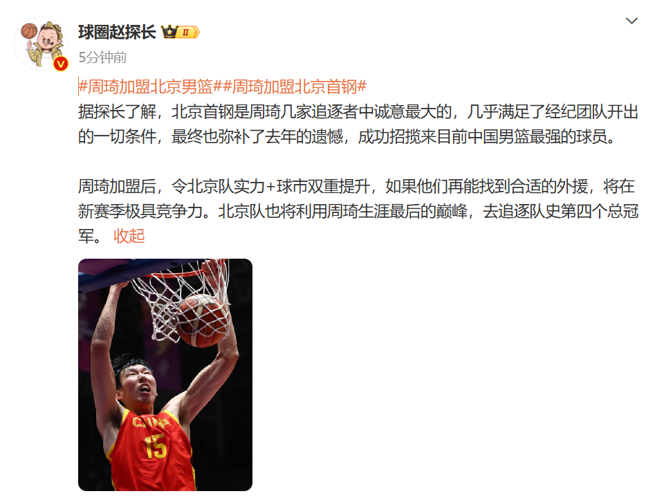 今日,名记贾磊爆料周琦即将加盟北京男篮。