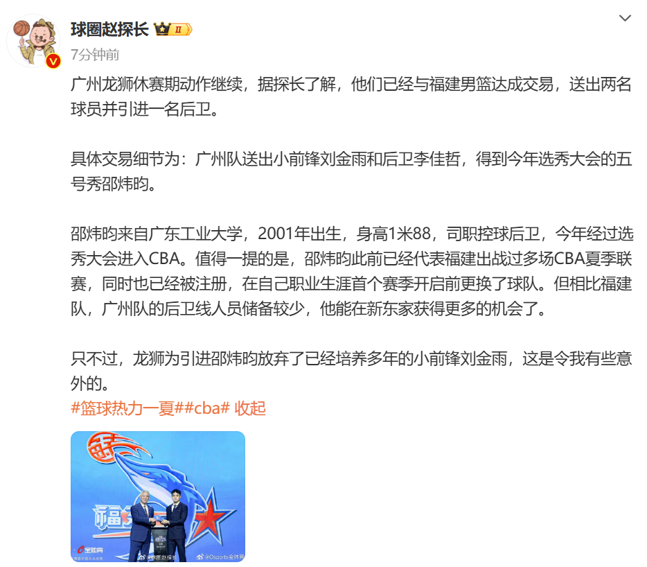 🌟媒体人:广州送出小前锋刘金雨与后卫李佳哲从福建换来今年的5号秀后卫邵炜昀