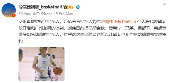 在此前达成的一笔重磅CBA三方交易中郭艾伦被交易到了广州龙狮俱乐部,根据媒体人@导演我躺哪透露郭艾伦目前已经更换了经纪人,今天将与广州龙狮俱乐部进行谈判。