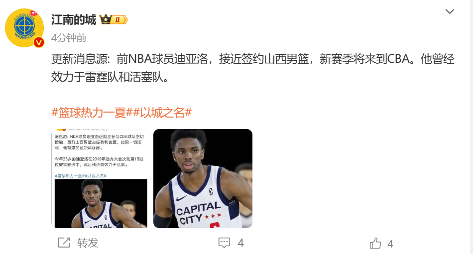 北京时间8月27日讯,根据媒体人@江南的城报道: 前NBA球员迪亚洛,接近签约山西男篮,新赛季将来到CBA。他曾经效力于雷霆队和活塞队。