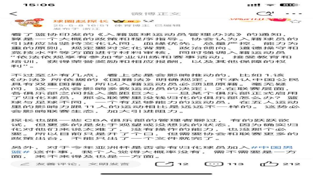 近日,中国篮协正式启动了归化球员的相关事宜,归化标准:坚持文化认同、总量控制、血缘优先和能力为重的四大原则。根据媒体人球圈赵探长称:“有的跃跃欲试,但绝大多数都在观望的状态,因为归化确实太难了,没有操作能力,也没有那个必要。”从赵探长的话里话外可以得知,联赛归化一事大概率泡汤,如此一来,就无法向篮协输送归化球员。
