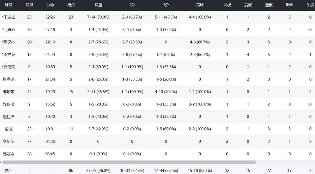 周琦投篮6中5,罚球12中9,狂轰19分20板大号两双;孙铭徽投篮15中9,罚球13中10贡献29分8助4板;胡金秋投篮16中9,得到21分9板准两双。