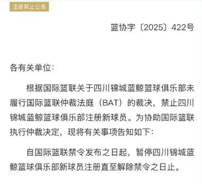 今年五月,中国篮球协会放出个消息,可把大家惊着了。原来是国际篮球联合会,因四川锦城蓝鲸篮球俱乐部没执行仲裁法庭裁定,不许它注册新球员。中国篮球协会为帮国际篮球联合会,也暂停四川男篮新球员注册,这禁令得等解除那天才作罢。