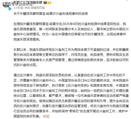 北京时间6月24日,新疆官方社媒回应哈雷尔兴奋剂事件:高度重视哈雷尔兴奋剂事件,坚决抵制任何兴奋剂。