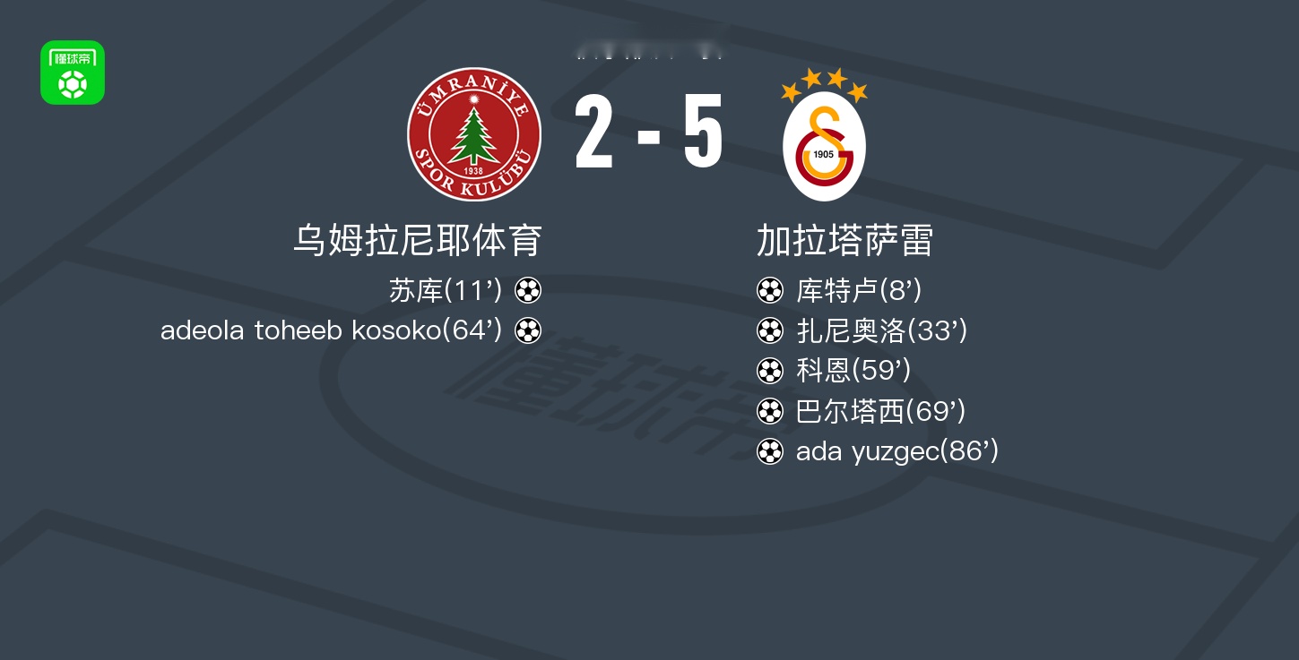 北京时间7月13日俱乐部友谊赛,乌姆拉尼耶体育对阵加拉塔萨雷。乌姆拉尼耶体育苏库破门,adeola toheeb kosoko破门。加拉塔萨雷库特卢破门,扎尼奥洛破门,科恩破门,巴尔塔西破门,ada yuzgec破门。最终比分乌姆拉尼耶体育 2 - 5 加拉塔萨雷。