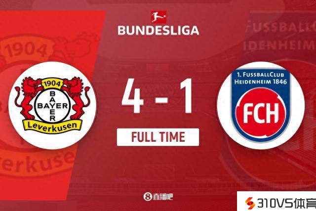 德甲-勒沃库森4-1海登海姆升第二 博尼法斯双响药厂6胜1平三线不败