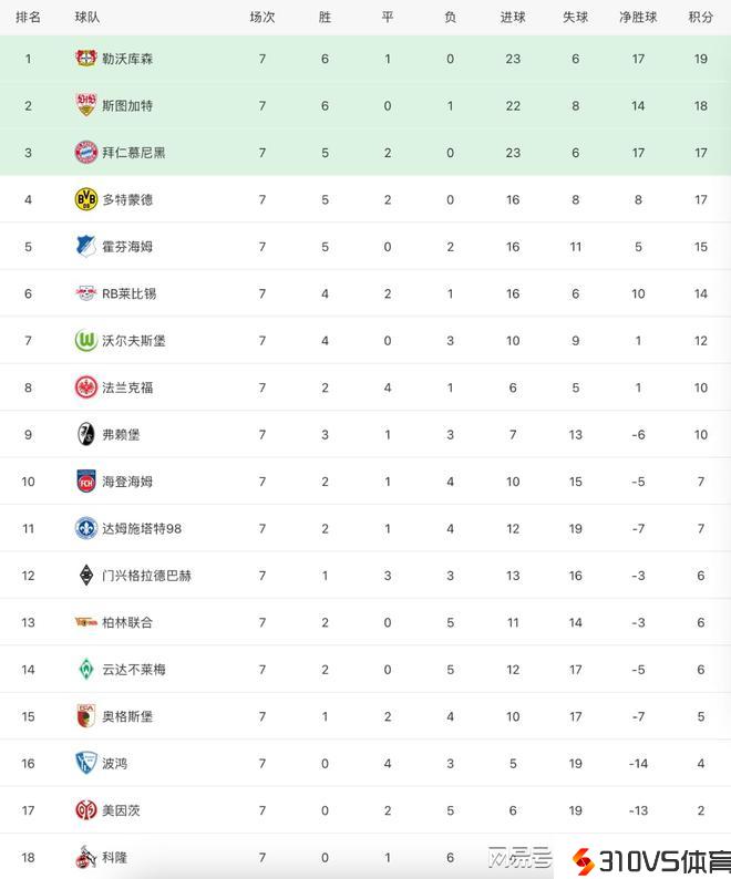 德甲最新积分榜:勒沃库森大胜继续领跑,拜仁坚持不败稳居第3!