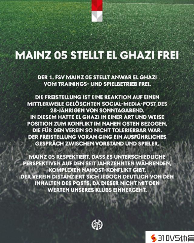 在美因茨此前的官方通告中,他们关于停训停赛埃尔加齐这一决议的缘由解释为“中东的状况十分复杂,球员社媒的内容与俱乐部价值观不符,俱乐部无法容忍这样的行为,球员将被停赛停训”。