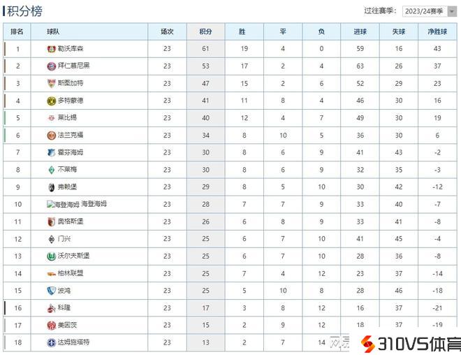 德甲最新积分榜:多特蒙德惨遭逆转仍居第4,法兰克福绝平位列第6