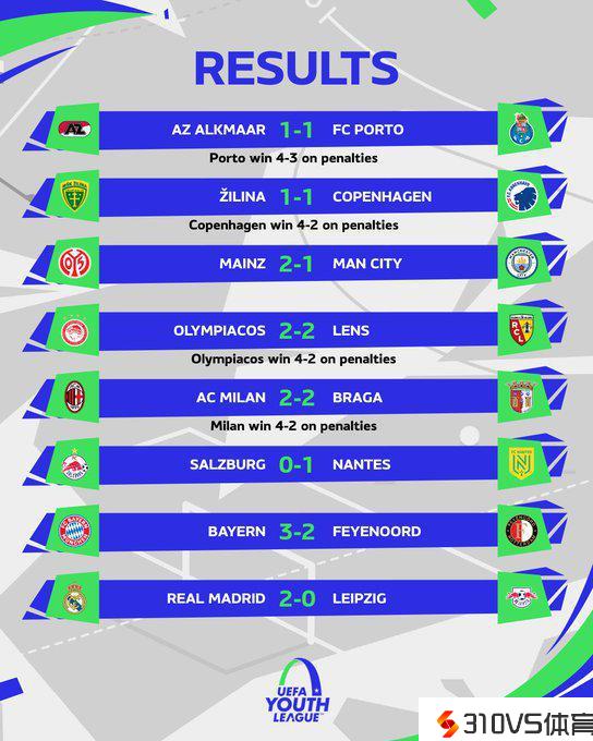 青年欧冠八强发生,1/4决赛米兰vs皇马,拜仁vs奥林匹亚科斯