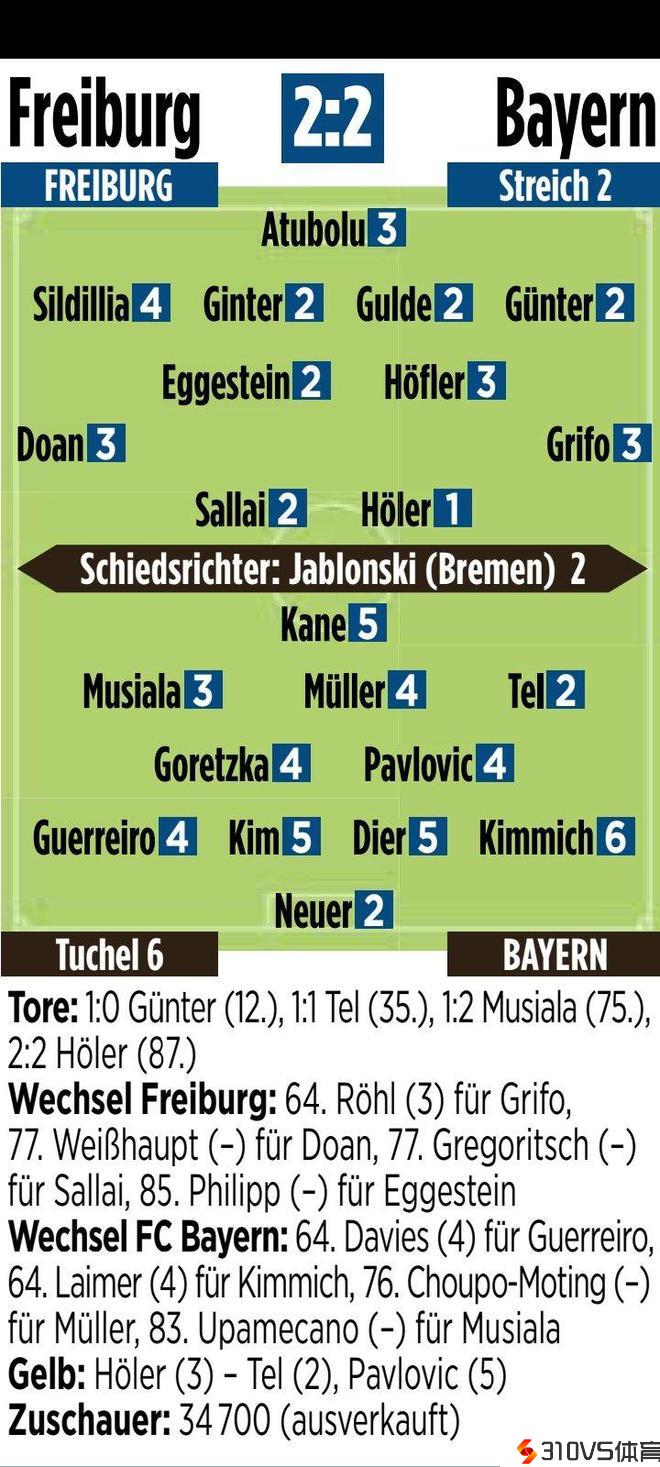 拜仁vs弗赖堡图片报评分:图赫尔、基米希最低,凯恩、戴尔低分