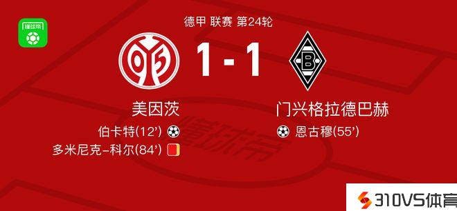 北京时间3月2日德甲 联赛 第24轮,美因茨主场对阵门兴格拉德巴赫。美因茨伯卡特破门。门兴格拉德巴赫恩古穆破门。最终比分1-1。