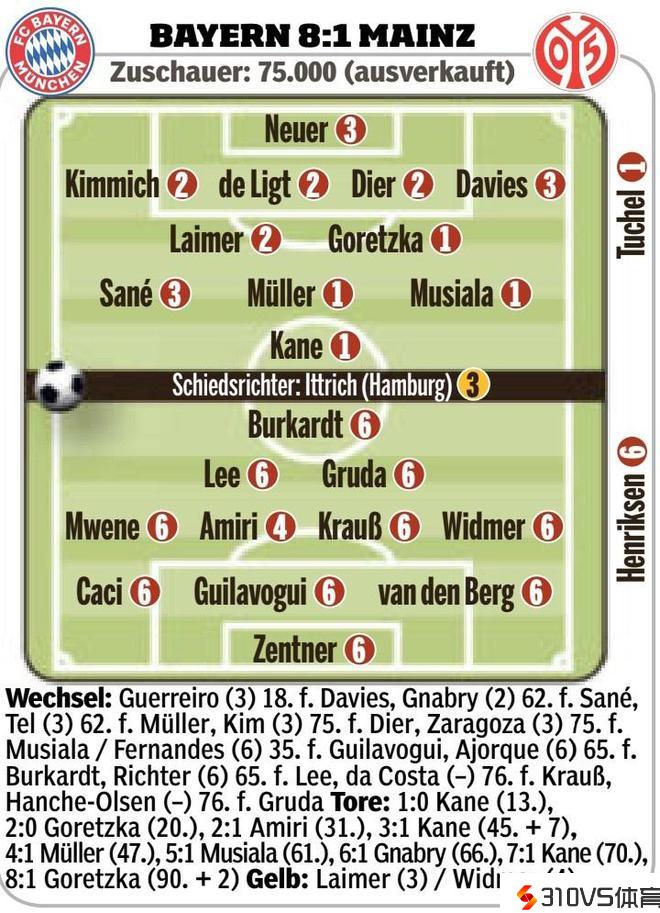 拜仁vs美因茨图片报评分:凯恩、穆勒、穆西亚拉、格雷茨卡最高