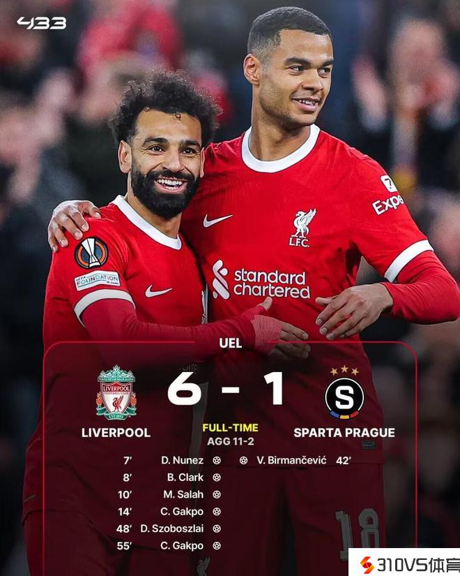 欧联杯1/8决赛次回合,利物浦主场6-1大胜布拉格斯巴达,以11-2的总比分晋级八强。上半场,努涅斯、克拉克、萨拉赫、加克波7分钟打入4球,下半场,索博斯洛伊破门,加克波梅开二度,萨拉赫则演出助攻帽子戏法。