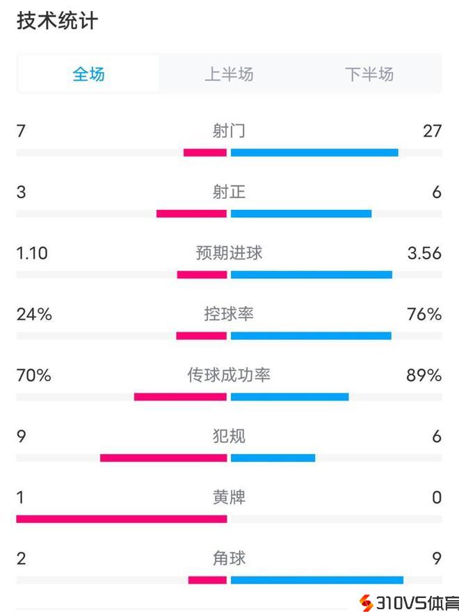 达姆施塔特VS拜仁全场数据:射门7-27,射正3-6,控球率24%-76%