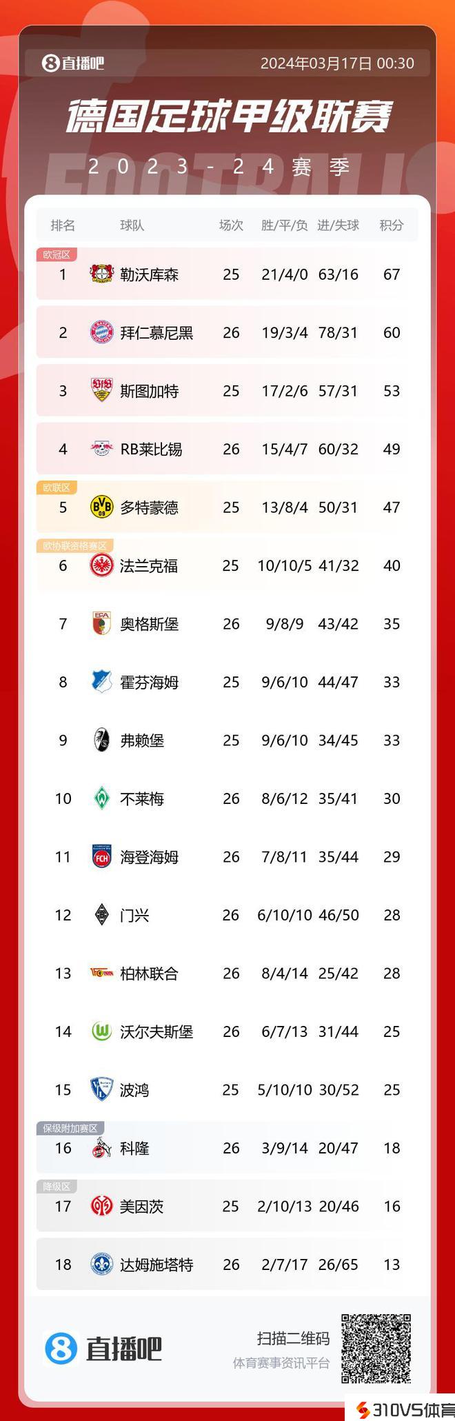 德甲积分榜:拜仁近两场联赛攻入13球,先赛仍落后药厂7分,