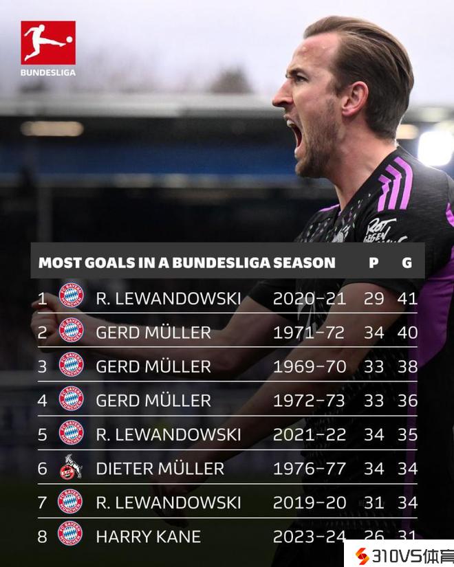 还剩8轮竞赛,凯恩以31球排名德甲历史单赛季进球榜第8位