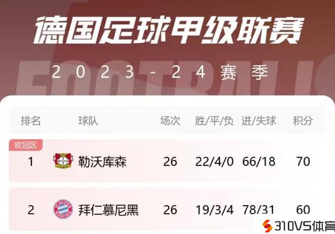 本赛季德甲26轮战罢,拜仁19胜3平4负拿到60分,目前排在德甲第2,落后榜首的勒沃库森(70分)10分。