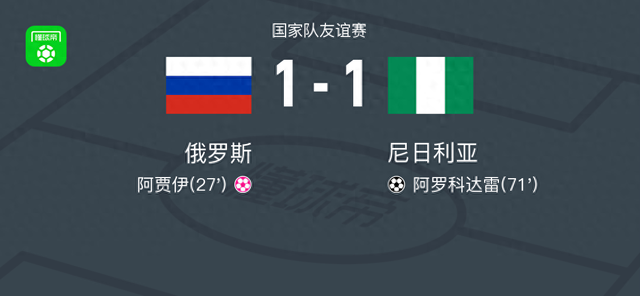 北京时间6月7日国家队友谊赛,俄罗斯对阵尼日利亚。尼日利亚阿罗科达雷破门,阿贾伊自摆乌龙。最终比分俄罗斯 1 - 1 尼日利亚。