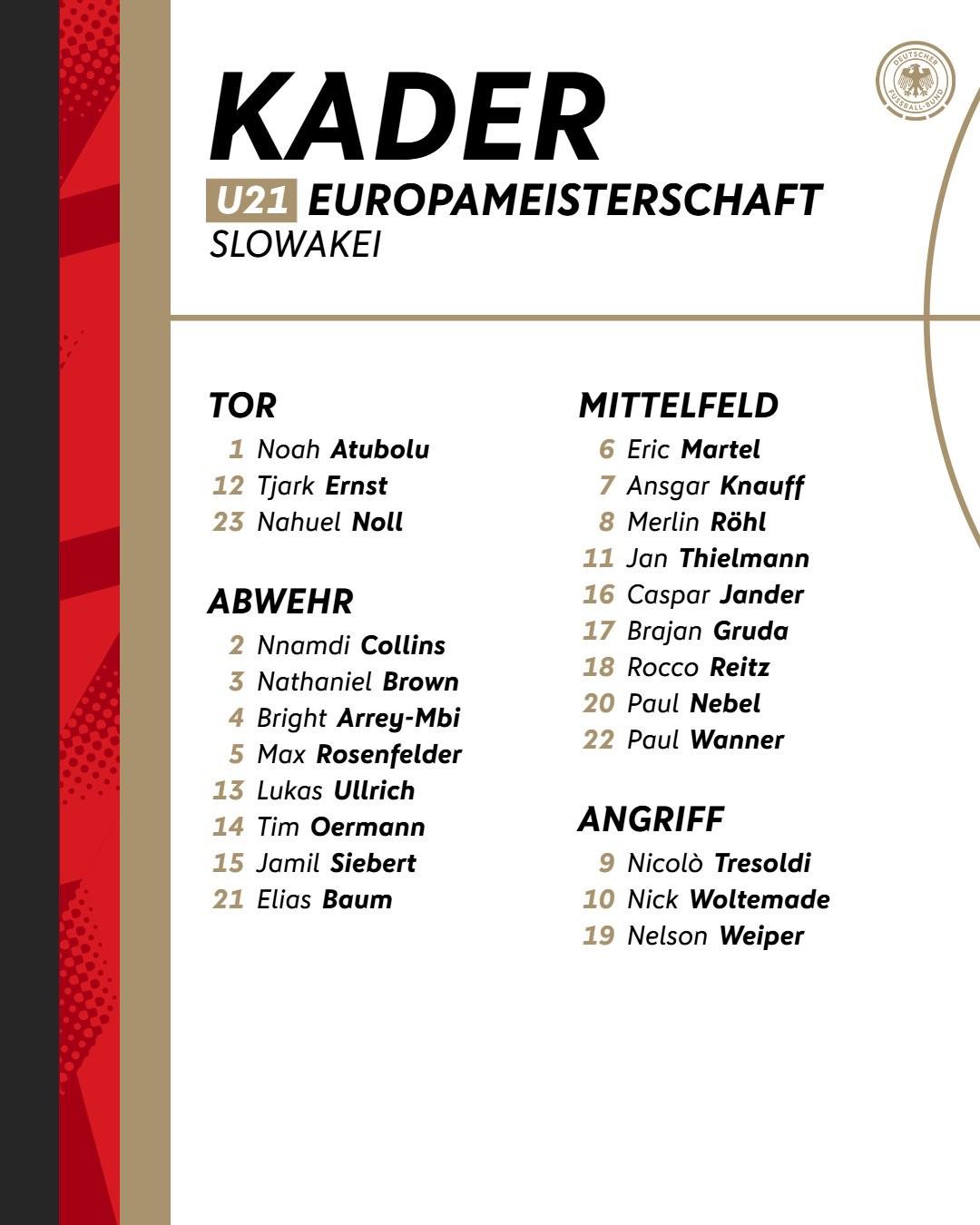 后卫:科林斯(法兰克福)、纳撒尼尔-布朗(法兰克福)、阿雷-姆比(布拉加)、马克斯-罗森费尔德(弗赖堡)、卢卡斯-乌尔里希(门兴)、厄尔曼(波鸿)、西伯特(杜塞尔多夫)、埃利亚斯-鲍姆(埃弗斯堡)