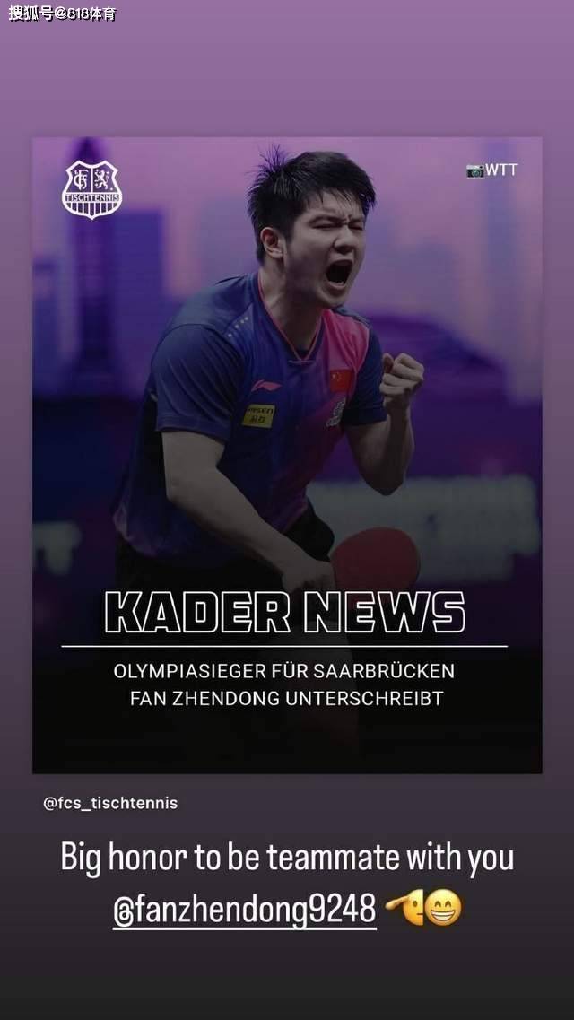 6月1日,28岁的樊振东正式加盟德甲萨尔布吕肯,签约1年,新赛季将和莫雷加德、弗朗西斯卡等欧洲名将共同效力该队。中国选手将代表球队出战德甲(非全部场次)、德国杯及欧冠赛事。