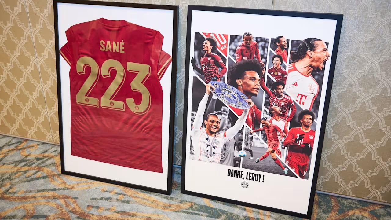 拜仁体育主管埃贝尔与体育总监弗罗因德一起带来了两份礼物:一件特别的球衣,上面印有萨内为拜仁出场的223场正式比赛的号码,以及一幅包含萨内五年拜仁生涯精彩瞬间的照片拼贴,上面写着“谢谢你,勒鲁瓦!”。