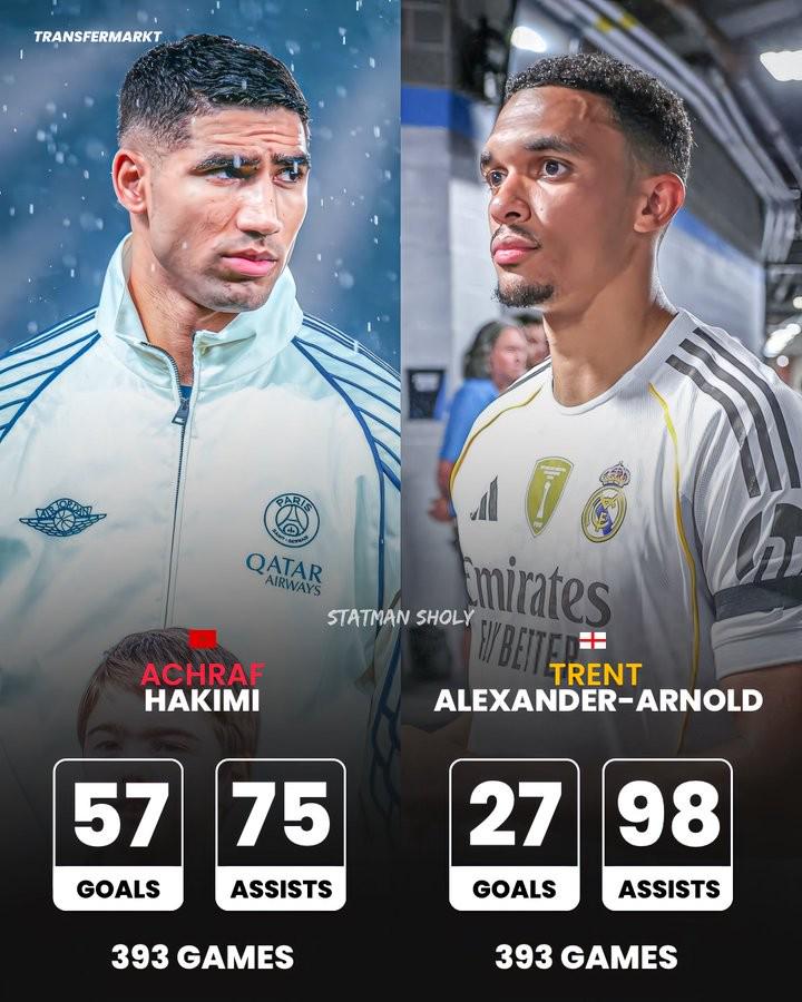 阿什拉夫与阿诺德目前都参加了393场正式比赛,阿什拉夫总共进球57个,助攻75个;阿诺德总计进球27个,助攻98个。