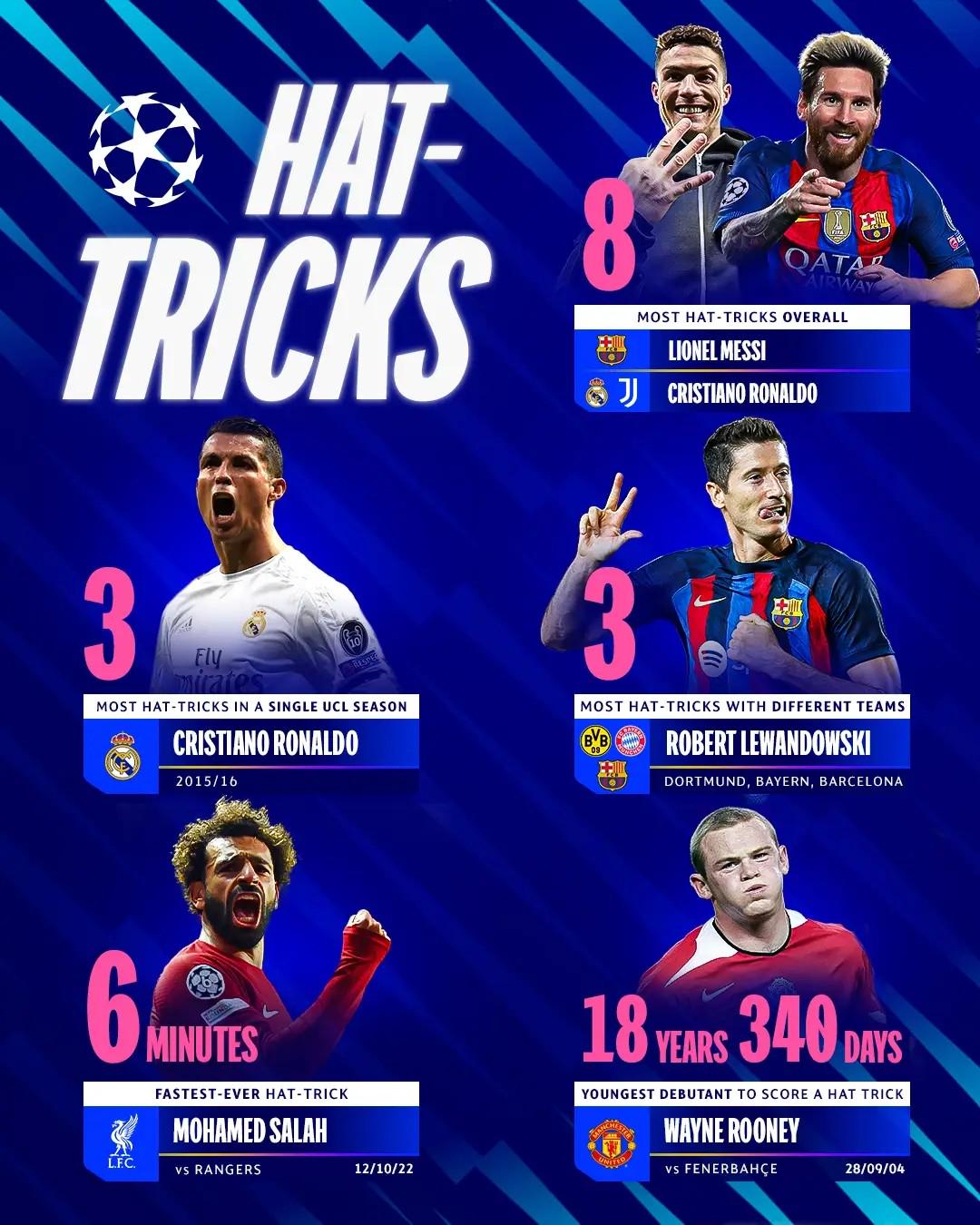 欧冠戴帽各项纪录:梅西&C罗8次最多,鲁尼18岁340天年龄最小