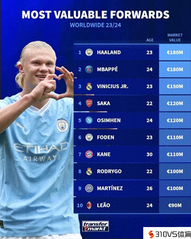 前锋身价排行:哈兰德、姆巴佩1.8亿欧居首,维尼修斯第三