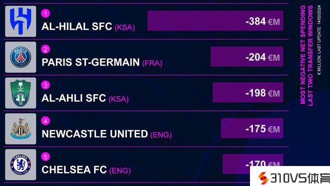 转会费净支出:新月3.84亿欧独一档,巴黎第2 纽卡第4 切尔西第5