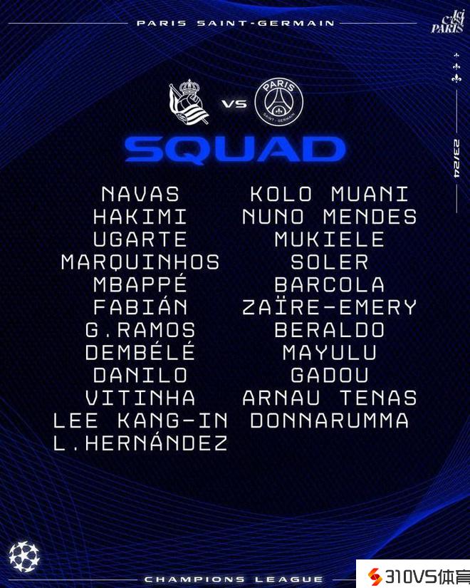 巴黎欧冠大名单:姆巴佩在列,阿森西奥、金彭贝、什克伤缺