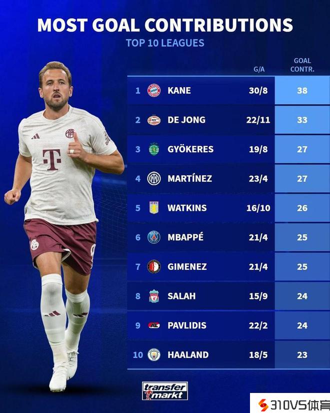 德转统计欧洲前10联赛直接参与进球排名:凯恩第1,姆巴佩第6