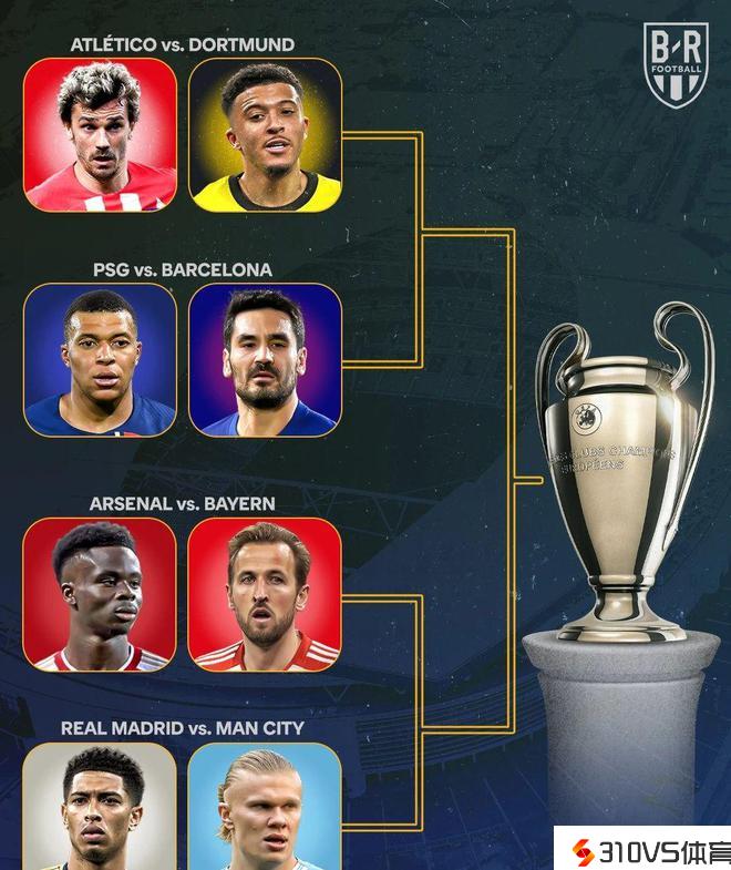 欧冠半决赛抽签结果也让四支最强球队分在了一同。阿森纳对阵拜仁的胜者将在半决赛中对阵皇家马德里对阵曼城的胜者。