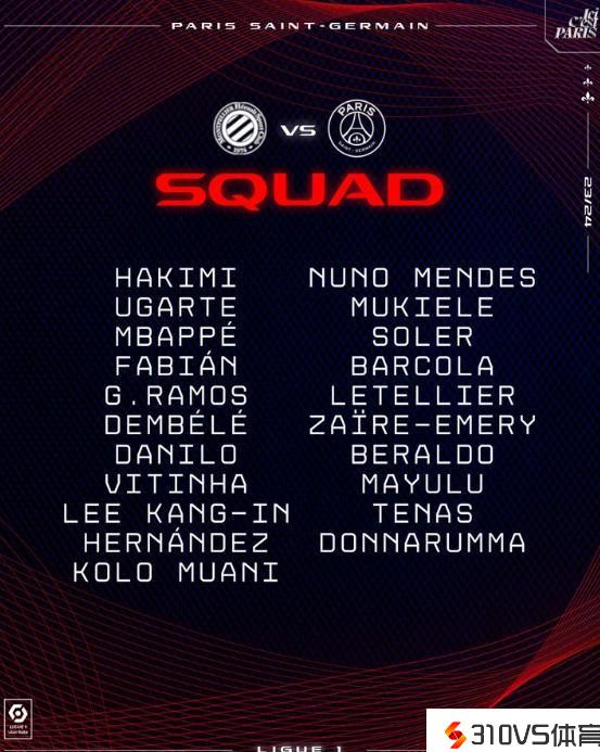 巴黎客战蒙彼利埃大名单:姆巴佩领衔,登贝莱、李刚仁在列