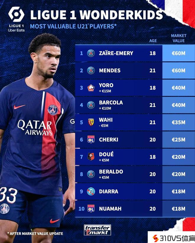 法甲U21球员身价榜:扎伊尔-埃梅里&努诺-门德斯6000万欧第一