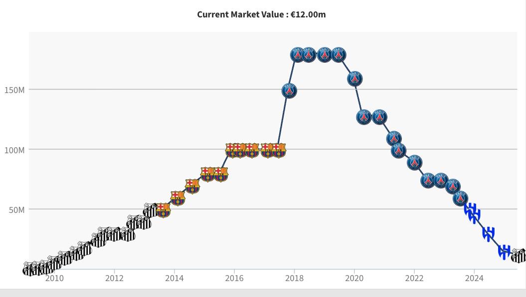 在最新一次德转身价更新中,内马尔身价从1500万欧跌至1200万欧。