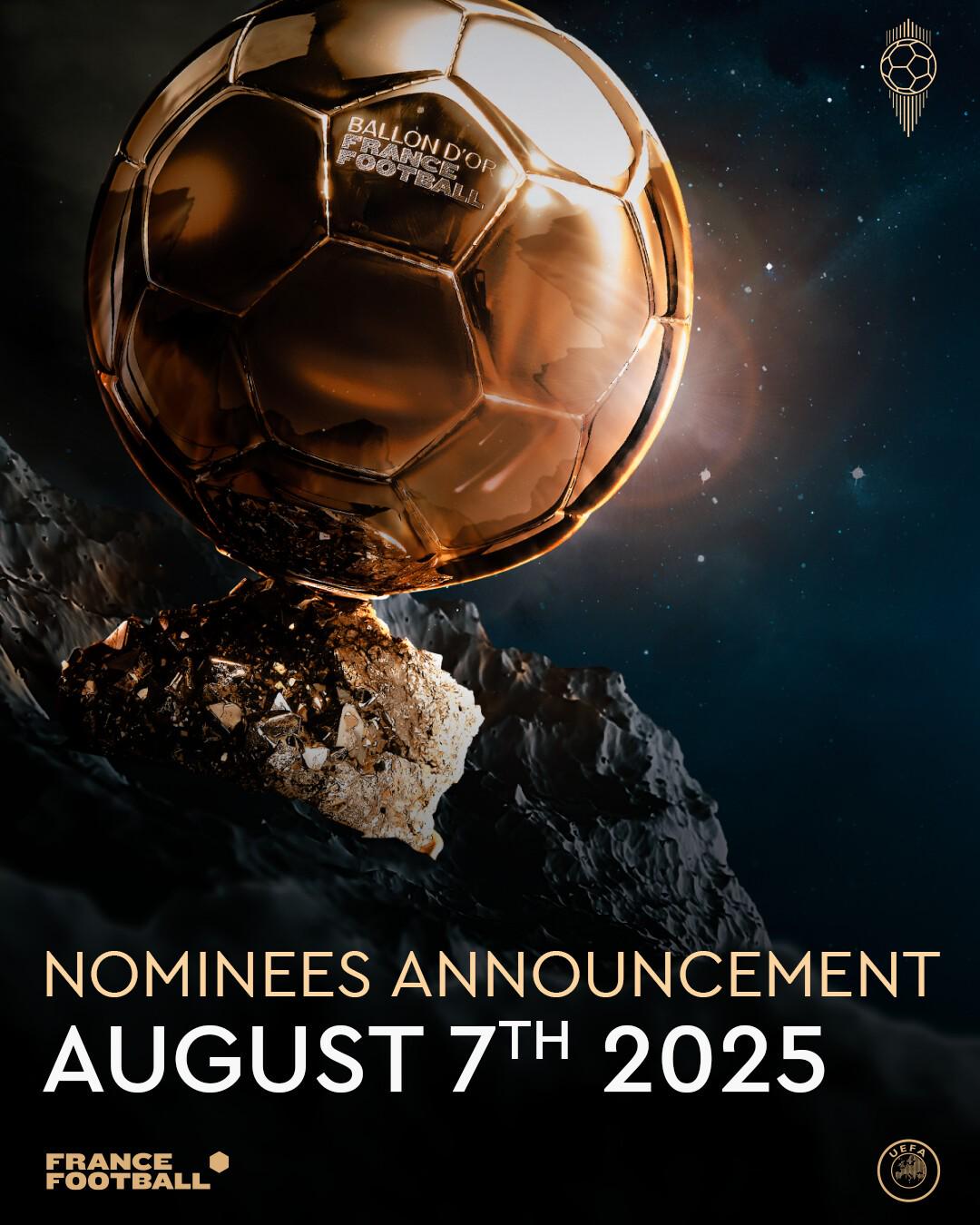 金球奖官方晒出了预告海报,其中可以看到,2025年金球奖候选将在8月7日公布。金球奖每年会公布30名球员作为金球奖候选,最终投票选出1人。