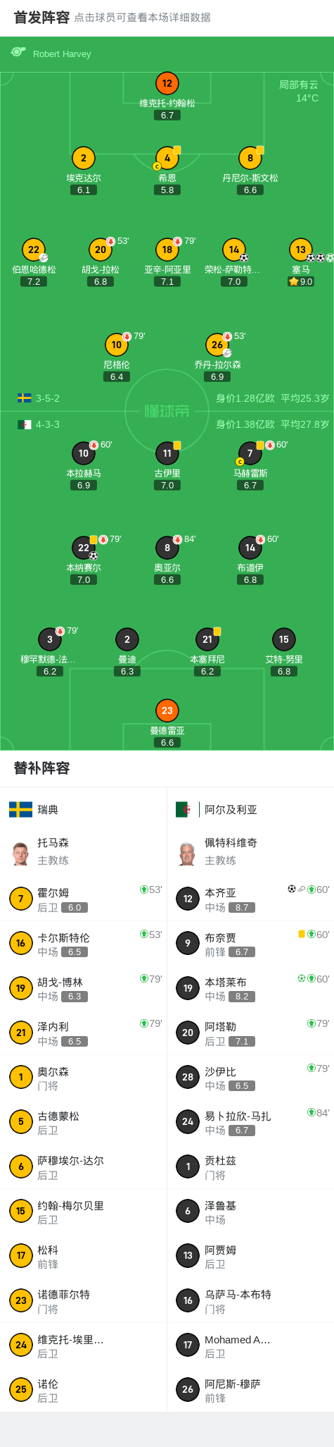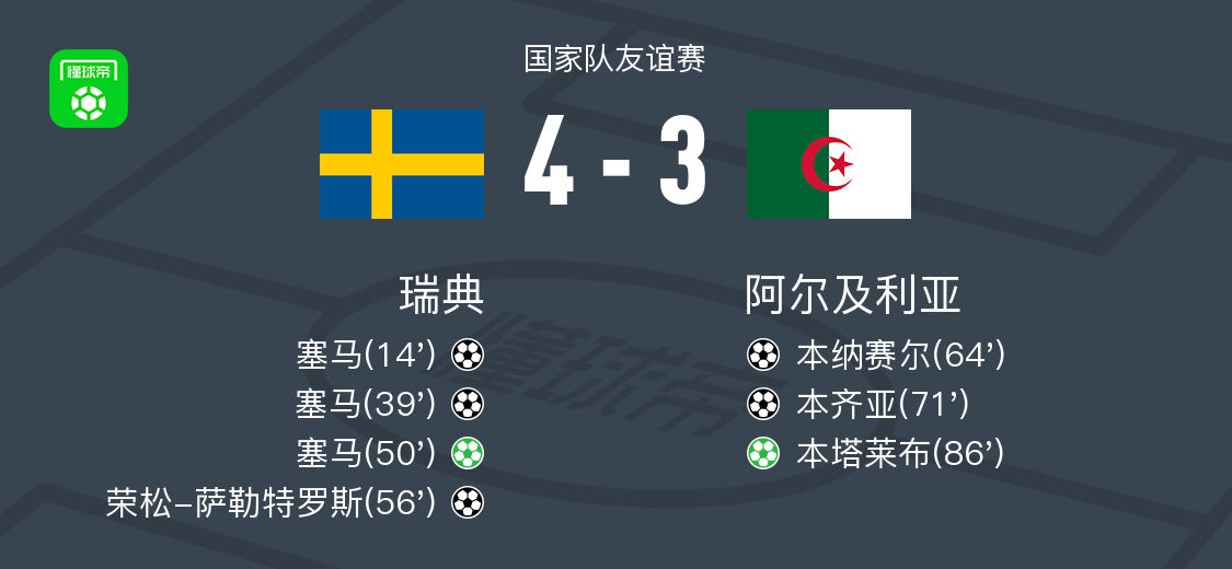 瑞典4-3阿尔及利亚,塞马帽子戏法,荣松-萨勒特罗斯建功