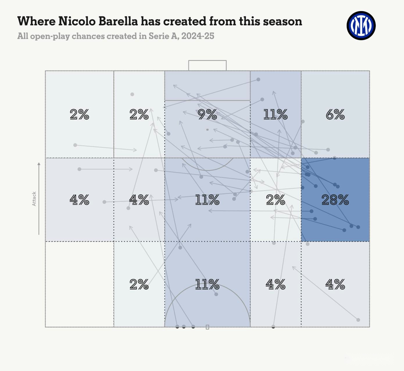 作为一名全能中场,巴雷拉从不停歇。这位身材矮小的撒丁岛人用巧妙的传球、全场范围内的创造力(如图所示)和充沛的体能弥补了身材的劣势。