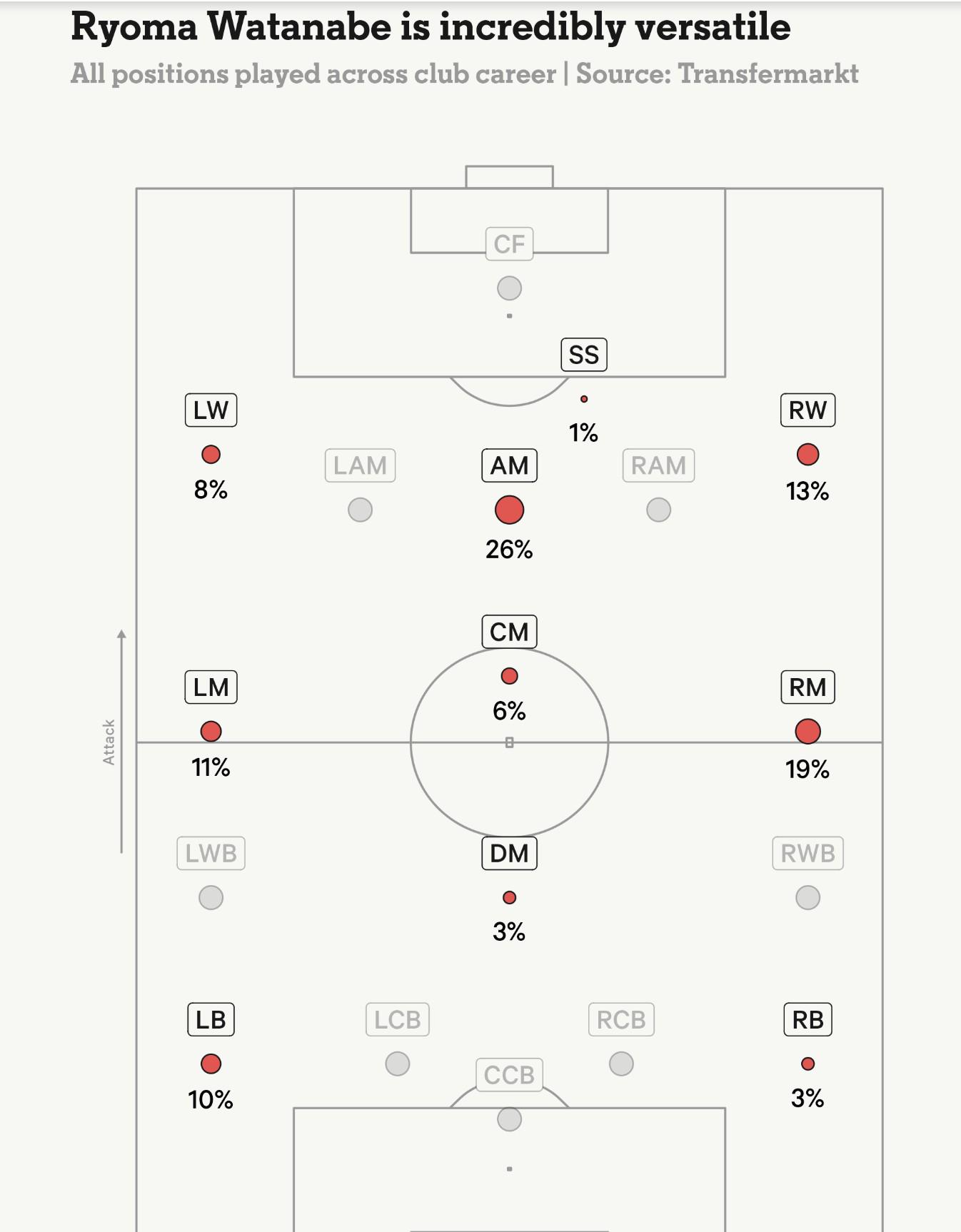 上赛季,他是浦和红钻出场最多的非门将球员,如今在2024赛季进行到一半时,他已经追平了去年整个赛季的进球数(六球——日本联赛按照自然年制赛季)。预计他将在前腰三人组中居中出场,不过他此前在多支球队中展现出能适应多个边路与中路位置的能力(见下图)。