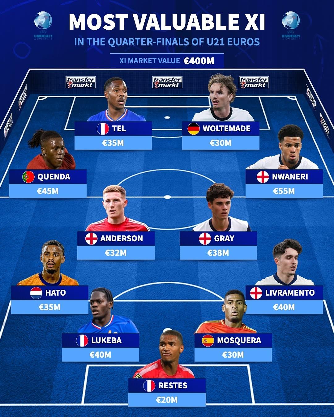 U21欧青赛八强球员身价最高阵:恩瓦内里领衔,总身价4亿欧