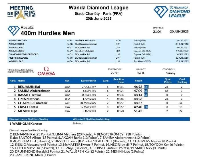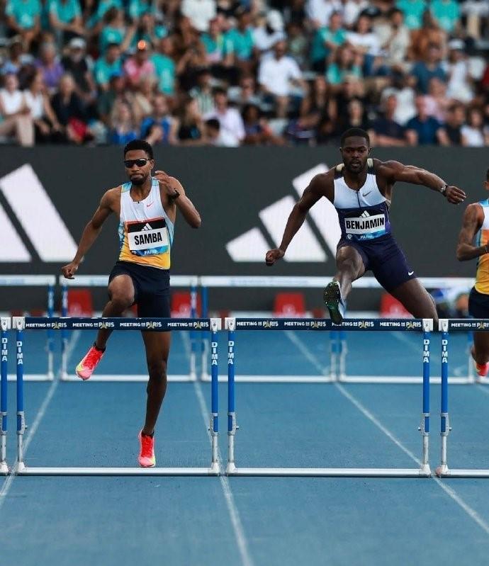 6月21日,2025年世界田联钻石联赛巴黎站男子400米栏,奥运冠军本杰明46秒93夺冠,萨姆巴47秒09,这是他2018年以来的最好成绩。