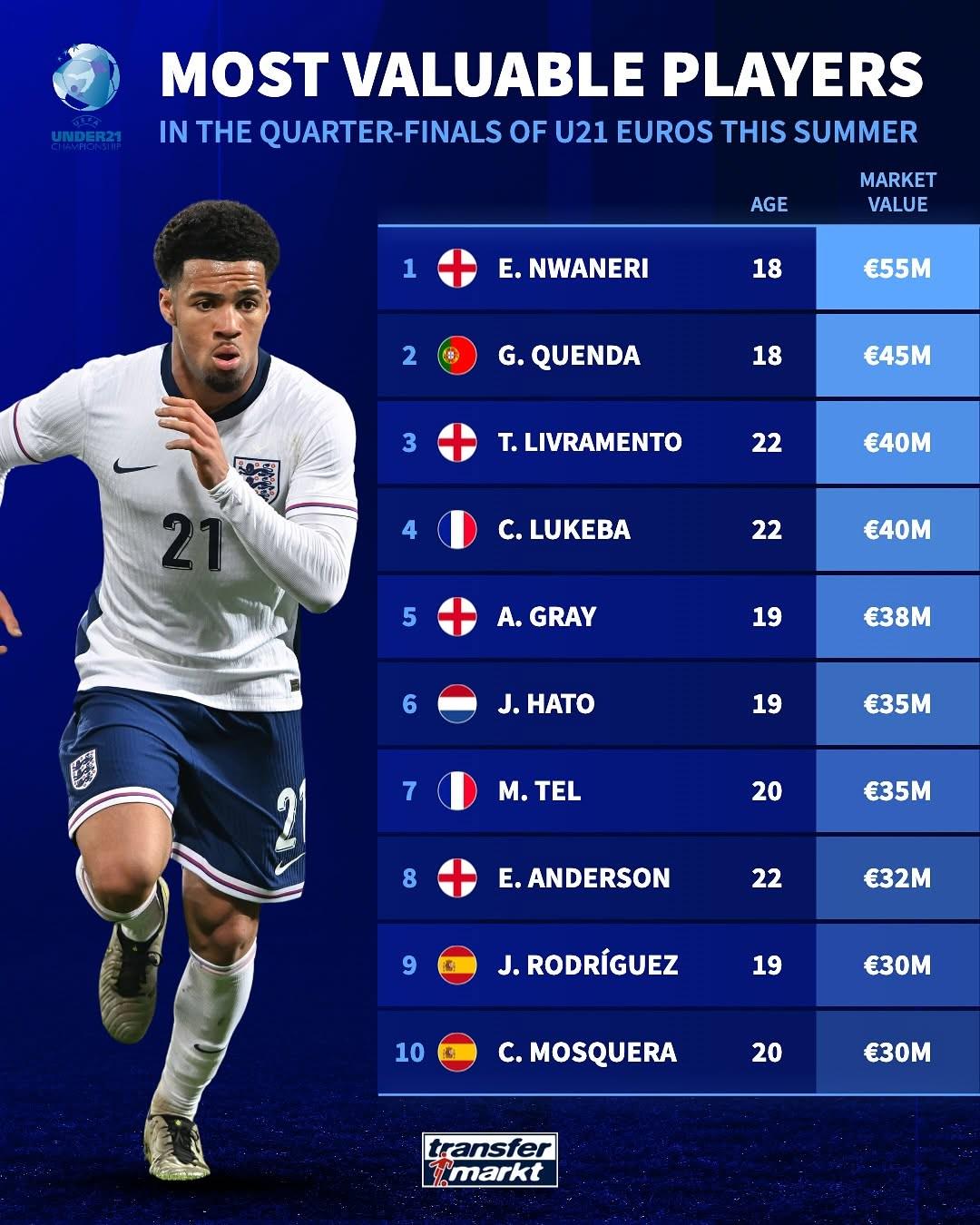 其中,英格兰小将恩瓦内里以5500万欧元高居榜首,葡萄牙的热奥瓦尼-昆达(4500万欧元)和英格兰的利夫拉门托(4000万欧元)分列二三位。前十球员中,英格兰共有4人入选。